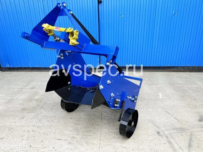 Это инструмент для выкапывания картофеля с ножом, лентой и колесами. Нож вырезает землю с клубнями и отправляет их на транспортерный механизм. Тот в свою очередь поднимает и раскладывает картофель на поверхности для сбора. Длина транспортера 600 мм. Устройство соединяется с трактором, минимальная мощность которого 18 л.с. со сцепкой и ВОМ.